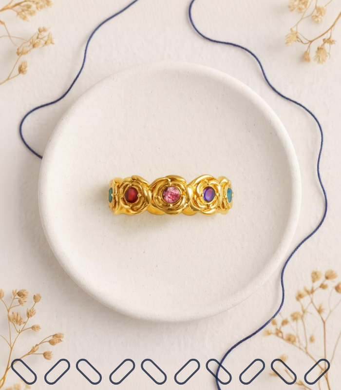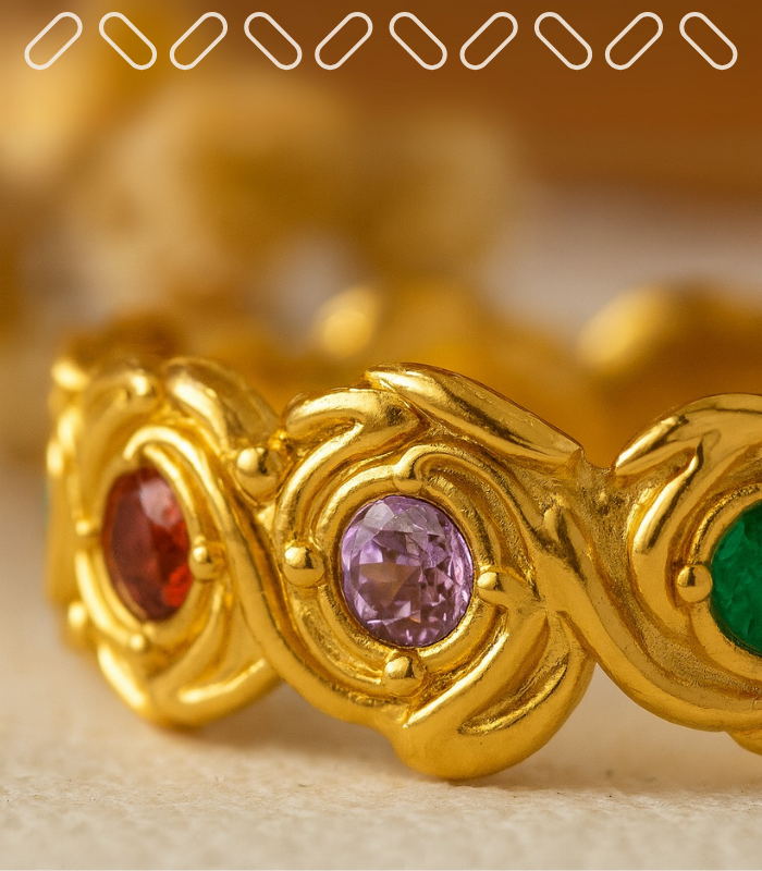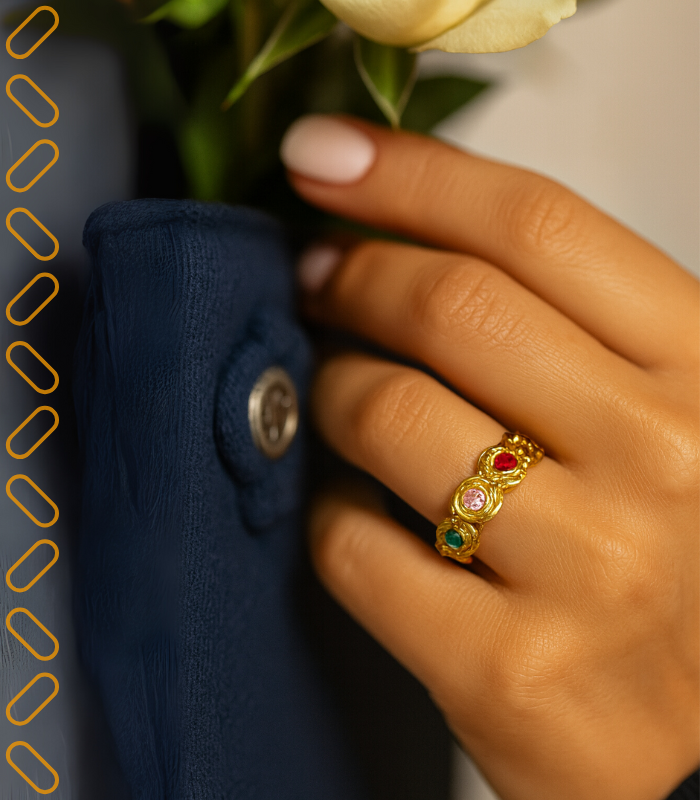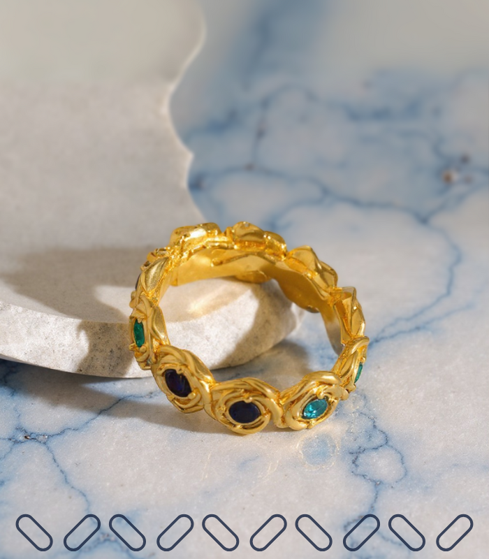Embodying the richness of treasures, this gold-plated ring wraps the finger in a vibrant spectrum of gem-like hues. Its smooth, hypoallergenic jewelry finish ensures all-day comfort, while the colorful design effortlessly complements both daytime looks and evening glamour, pairing beautifully with any outfit.