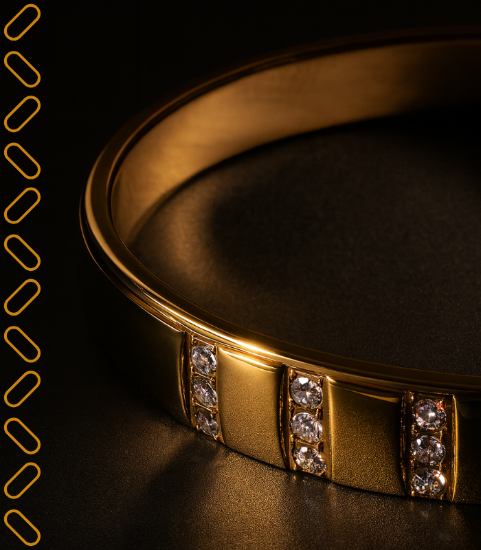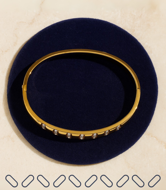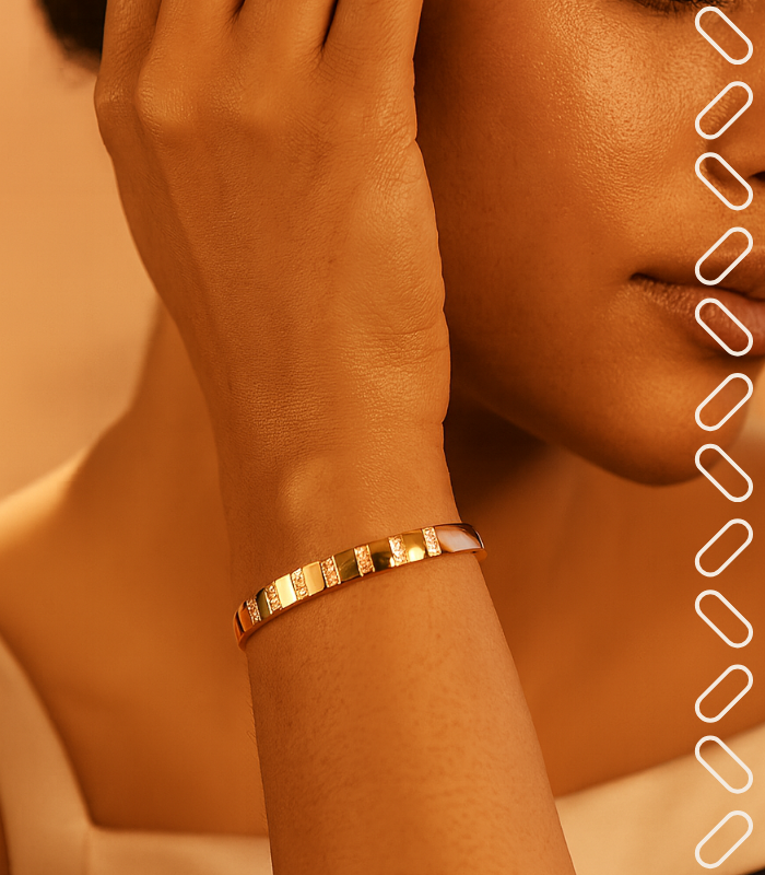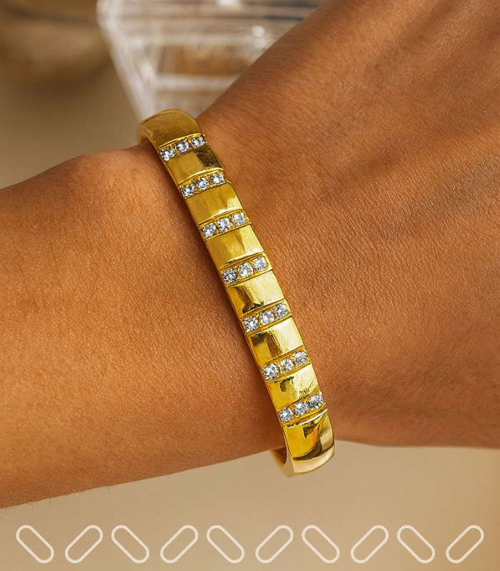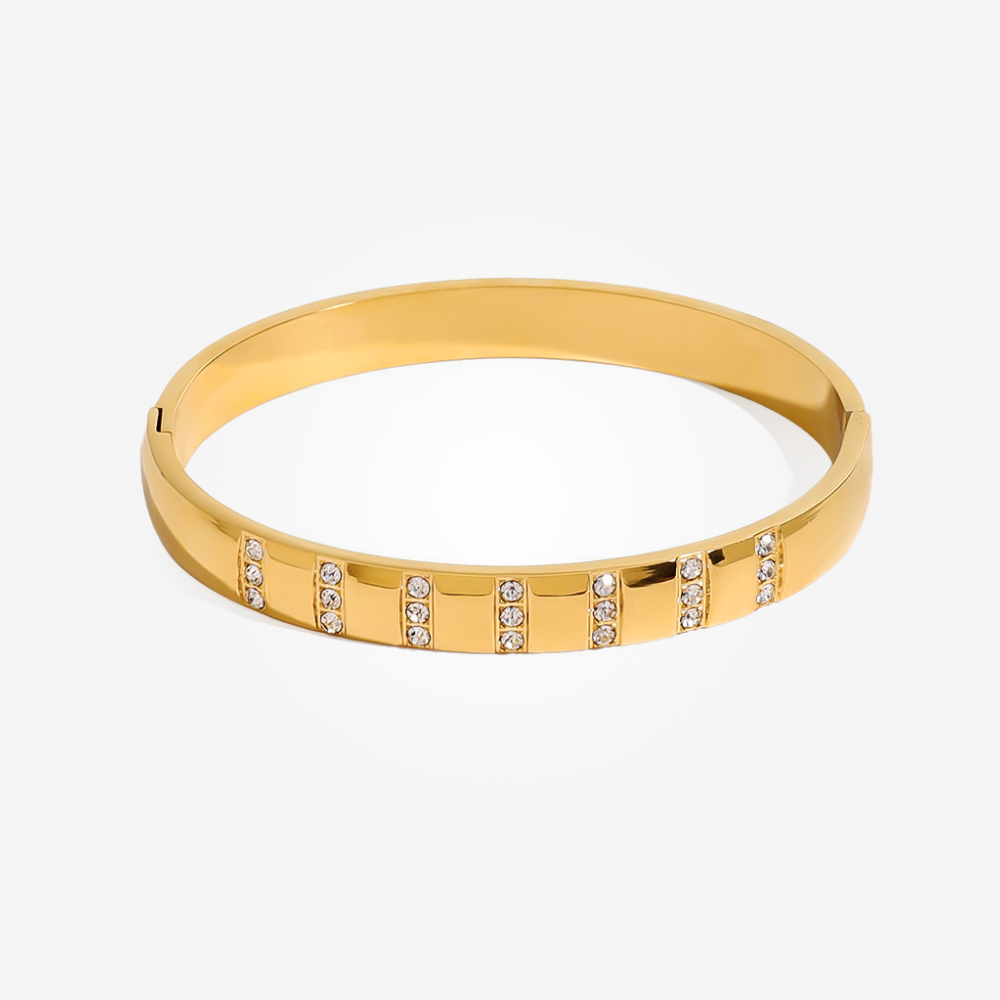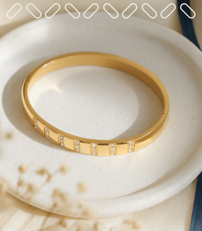 Mirroring the orderly luxury of cushions set in perfect rows, this gold-plated bangle showcases precise vertical columns of clear stones that punctuate its smooth band. Crafted as a hypoallergenic jewelry essential for effortless wear, its rhythmic geometry catches the light, creating a sophisticated structure ideal for daily elegance.